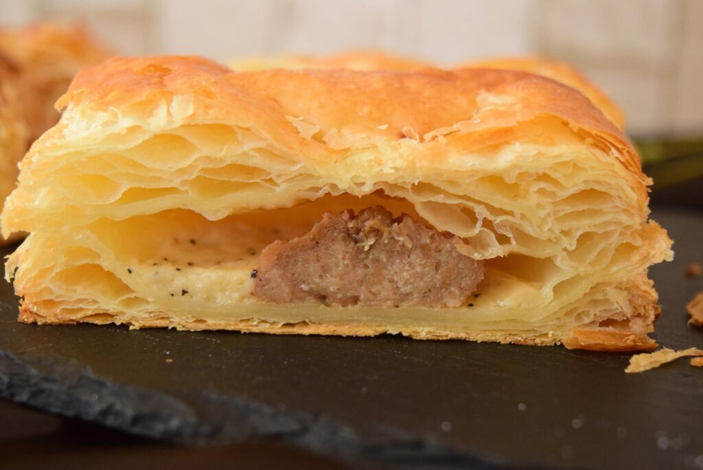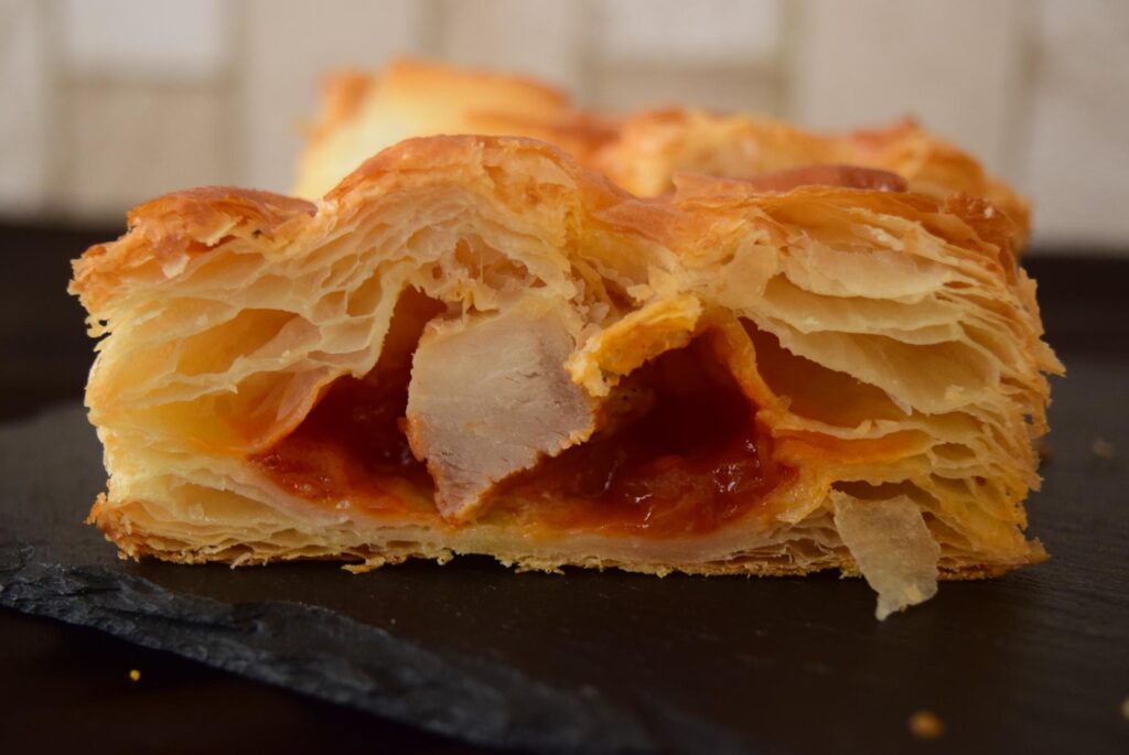ゴロッとしたチキンにチリソースを合わせ、サクサクのパイ生地に包んで焼き上げました。