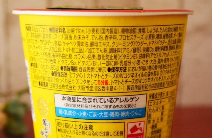 スープの原材料を見ると豚脂・粉末味噌・香辛料がメインの味付けのようです。また、プロセスチーズ・クリーミーパウダー・トマトパウダーなどの洋風で辛さを軽減しそうな調味料も含まれていました。