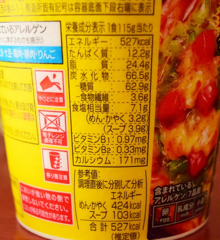1食115g当たり527kcal。糖質は62.9gで食塩相当量は7.1g(めん・かやく3.2g、スープ3.9g)。