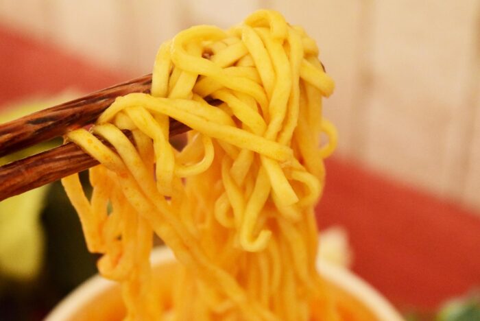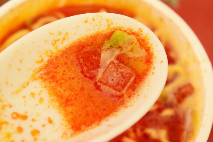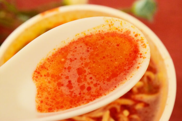 平たい麺はスープとよく絡み、筆者としては好みです。中本のお店と比較すると全く異なりますが、これはこれで悪くはないといった印象です。麺が結構スープを吸い込むので、麺だけ食べていても舌がビリビリ……。辛いのが苦手の人にとっては厳しいと思います。