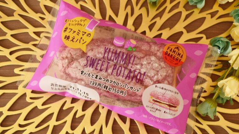 2021年10月26日(火)、関東甲信地域(東京都・神奈川県・埼玉県・千葉県・茨城県・群馬県・栃木県・山梨県・長野県・静岡県一部店舗)限定品として登場したファミリーマート「紫いもと黒みつのマカロンパンサンド」。