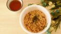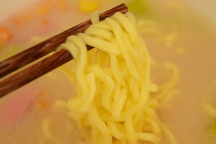 麺はもちもちということですが、どちらかというとゴワゴワとする食感で極太とはいかないものの、太めの麺ではありました。ノンフライなので油っこくなく食べやすいのがいいですね。