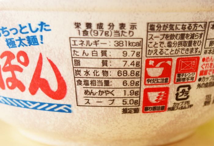 1食(97g)あたり381kcal。食塩相当量は6.9g。めん・かやくが1.9gでスープが5.0gです。