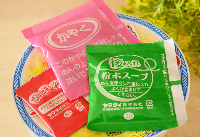 かやくと後入れ粉末スープ、調味料が中に入っています。