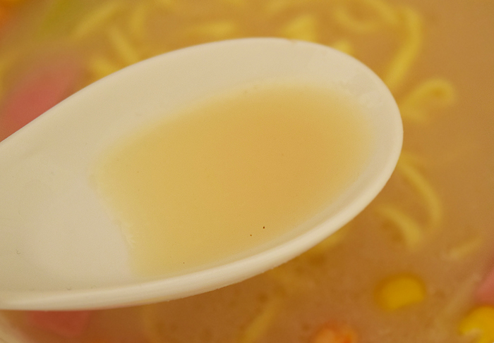 スープはわりと塩っ気が強いものの、野菜やだしの旨みはそこまで感じません。黒胡椒は入っていますが、そこまで効いていませんでした。ちゃんぽん独特の味がありながら、塩分が強いスープといった印象です。