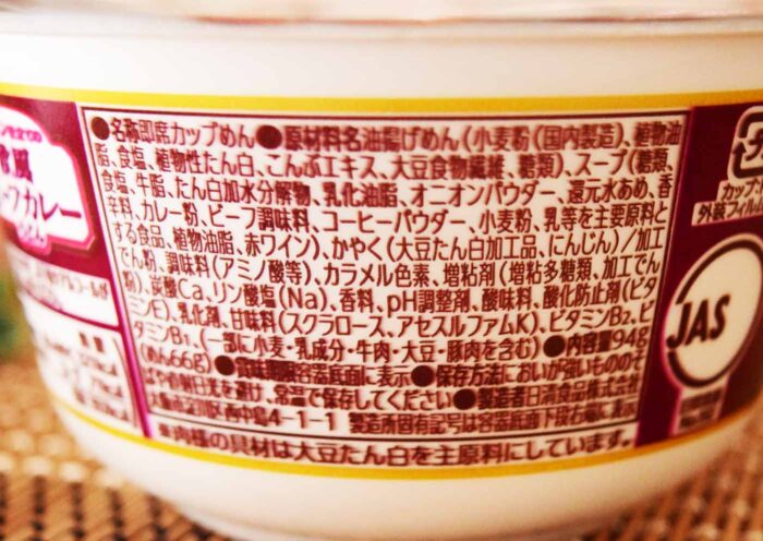原材料のスープを見るとカレー粉・コーヒーパウダー・赤ワインが入っていました。まさに洋風カレーですね。
