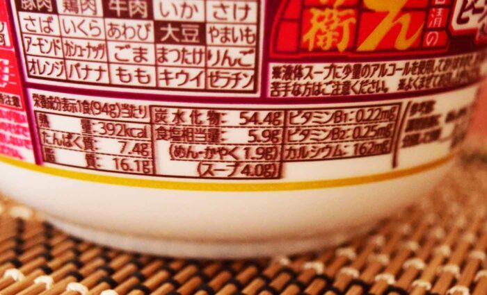 1食(94g)当たり392kcal。食塩相当量は5.9g(めん・かやく1.9g、スープ4.0g)で炭水化物は54.4g。