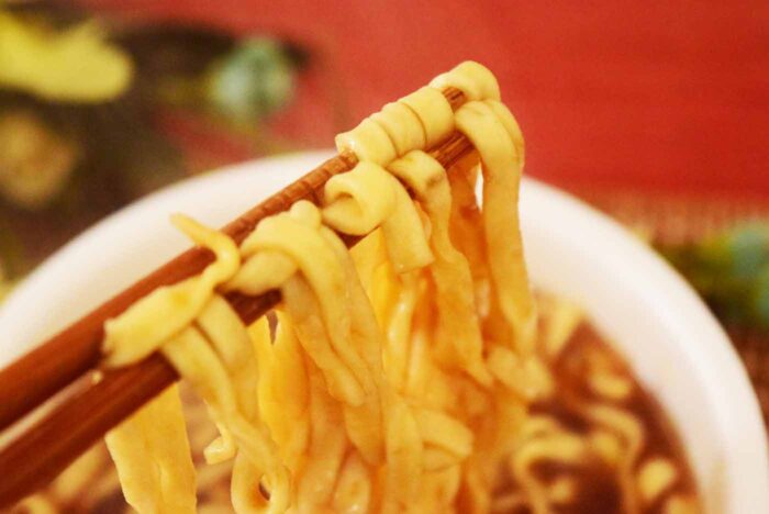 洋風カレーとうどん麺との相性ですが、悪くはありません。どん兵衛はストレートぎみの平打ち麺のため、スープをうまくからめとり、平たいパスタを食べているような感覚に近いともいえます。これがぶっとい讃岐うどんだったら、相性最悪でしたね。