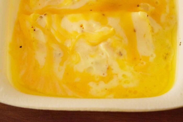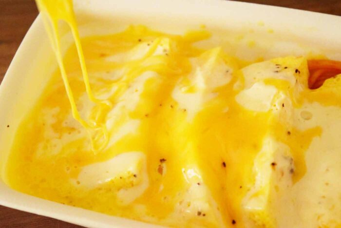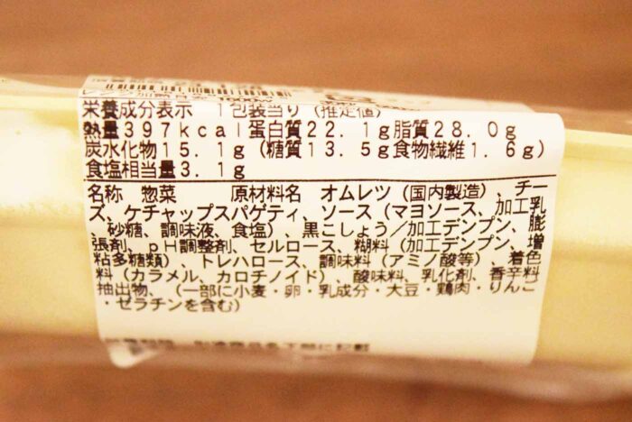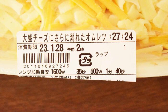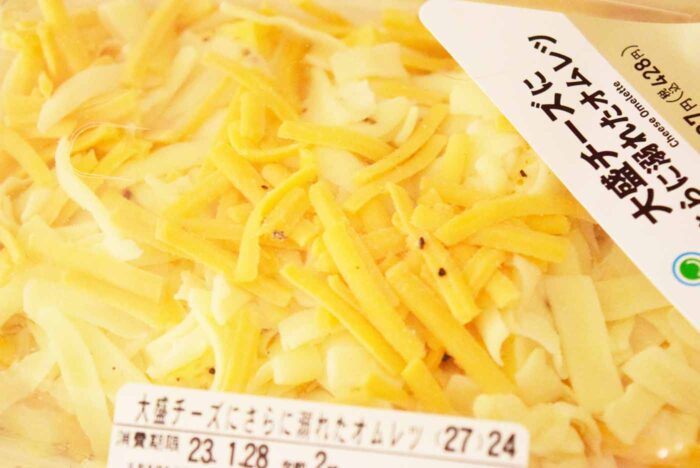 温め終わった商品がこちら。チーズの量が半端ないです。オムレツはチーズに溺れていますね。
