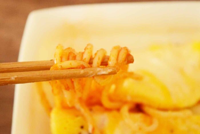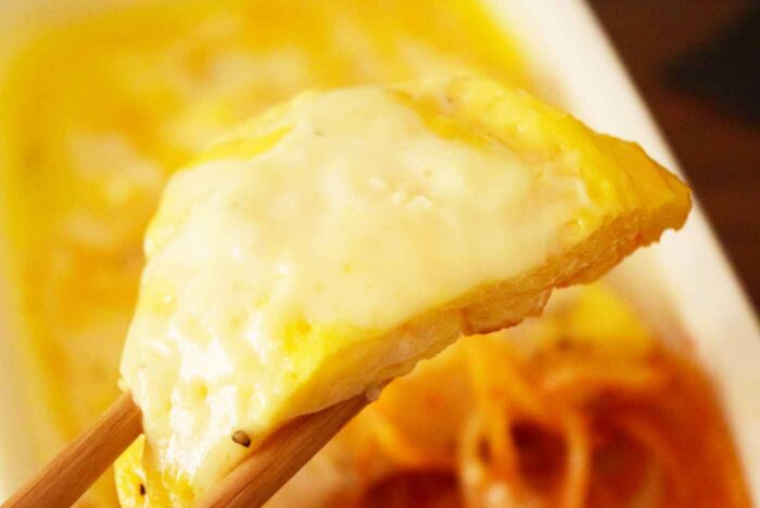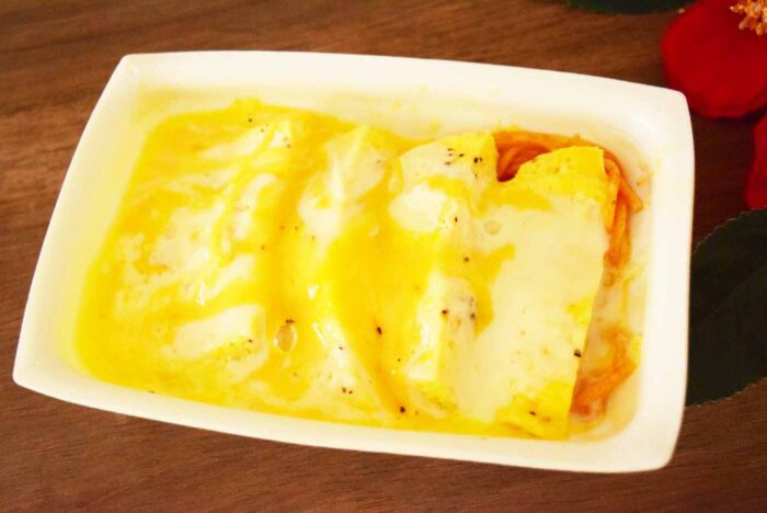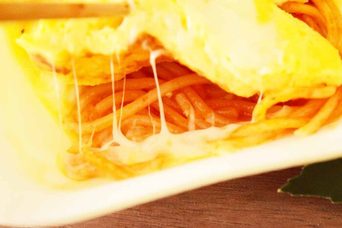 端っこの方がチーズの量が多いので、オムレツが見えなくなってしまいました。まさに溺れています。