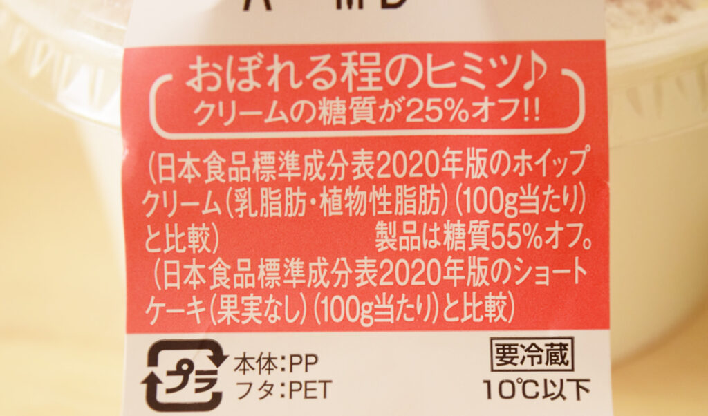答えはクリームの糖質が25%オフということでした。こんなにスイーツスイーツしているのに、実は糖質カット系のスイーツだったんです。