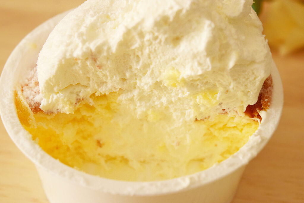 半分まで食べ進めると、チーズスフレの奥深くまで生クリームがつまっていました。さすがおぼれるほどの生クリーム。