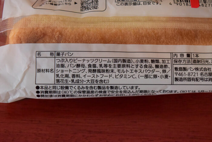 原材料にはつぶ入りピーナッツクリーム(国内製造)、小麦粉、糖類、加工油脂、パン酵母、食塩、乳等を主要原料とする食品、醸造酢、ショートニング、発酵風味粉末、モルトエキスパウダー、卵/乳化剤、香料、イーストフード、ビタミンC、(一部に卵・小麦・落花生・乳成分・大豆を含む)を使用しています。