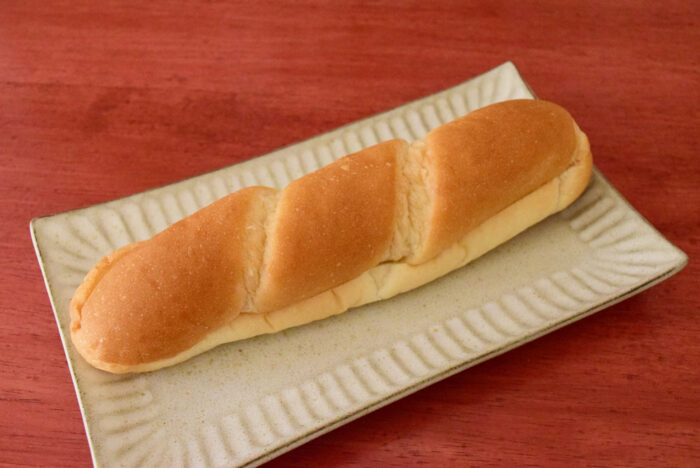袋から取り出しました。ソフトパン生地が特徴的でやや小さめのパンです。