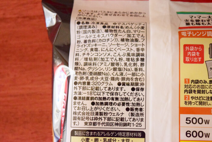 製造元は日清製粉ウェルナ。植物性たんぱく・マリーゴールドエキスパウダー・加工でん粉・着色料・植物油脂・フライドズッキーニ・ソーセージ・ショートニング・食塩・ニンニクペースト・香辛料・チキンコンソメ・昆布風味調味料など原材料に含まれています。