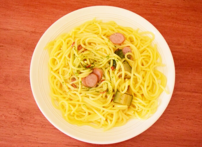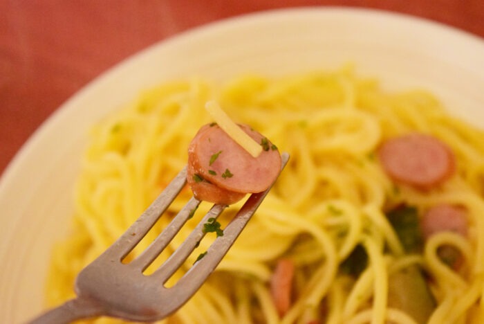 ニンニクの味はそこまできつくなく、コンソメの味が効いていて全体的に思ったよりもマイルド。ソーセージなどの出汁も効いていて、バランスのいい味になっています。そして、麺もコシが効いていて悪くありません。サイゼリアのペペロンチーノよりも美味しいです。