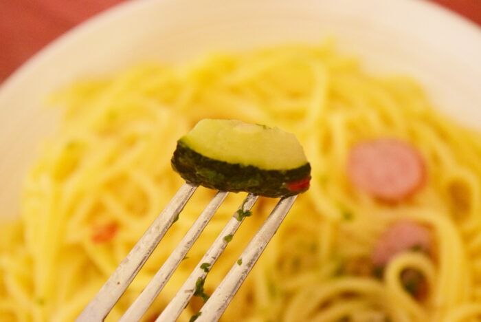 ズッキーニもそれなりに量が入っています。ソースを吸っていて思ったよりもあっています。美味しいですね。