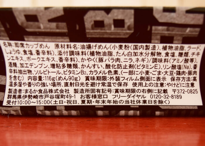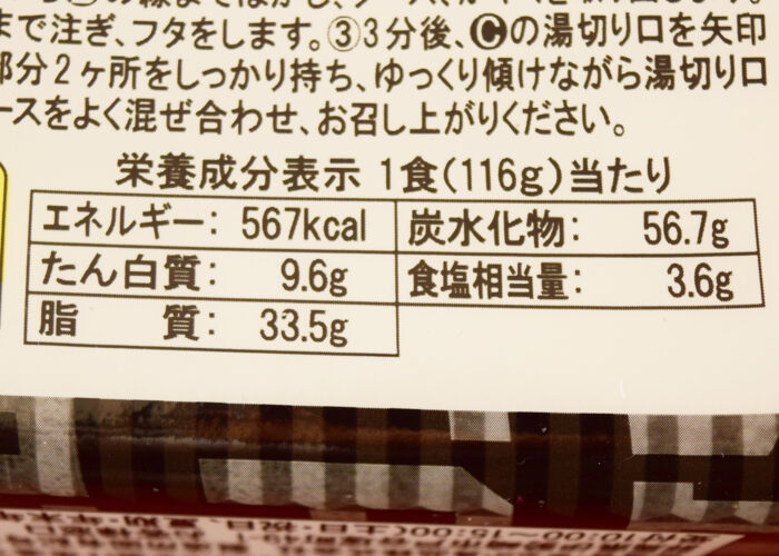 1食(116g)あたり567kcal。炭水化物は56.7gで食塩相当量は3.6gでした。ペヤングは1食140gのメニューもあるので、量は普通。