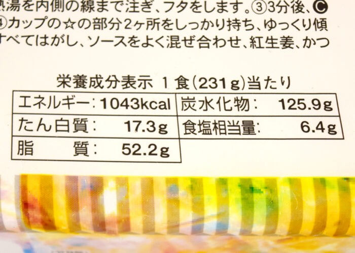 1食(231g)当たり1043kcal。炭水化物は125.9g、食塩相当量は6.4g。