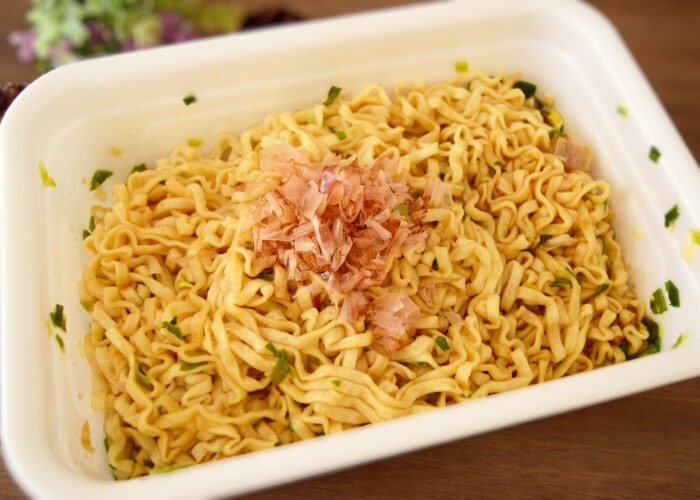 まずは麺から一口。コシはそこまで強くありませんが、鰹節が効いた醤油ソースで醤油味の焼うどんに近い味です。油麺のためどうしても油っこく、本来の焼うどんよりも水っぽくなってしまうのはカップうどんの限界ともいえるかもしれません。油っぽいものの、ソースがさっぱり目のため、超大盛でもそれなりに大食いなら苦も無く食べられると思います。筆者は大人2人で分けてちょうどいい量でした(そう考えるとコスパ良し)。