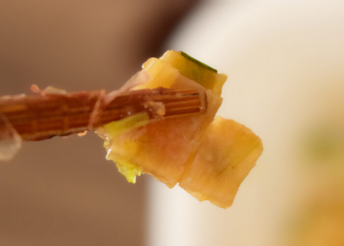 ねぎの他に豚バラ肉もかやくに入っています。食べごたえはありますが、麺の量と比較すると少ないため物足りないところもあります。ねぎの味は麺に結構染み込んでいるため、存在感抜群でした。