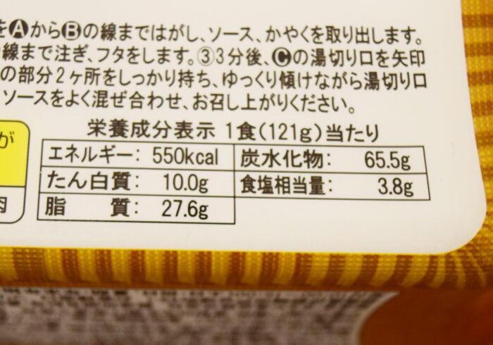 1食(121g)あたり550kcal。食塩相当量は3.8gでした。