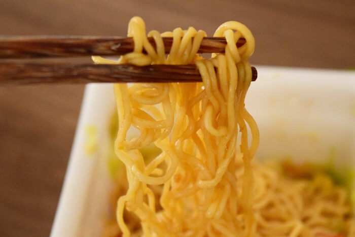 ペヤングおなじみの油麺。通常のペヤングとの違いは乾燥した状態ではよくわかりません。麺の調理時間は3分でした。