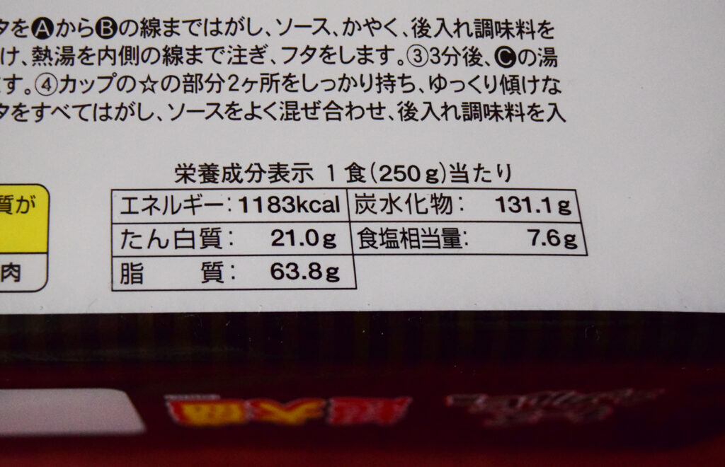 1食(250g)当たり1183kcal。炭水化物は131.1gで食塩相当量は7.6g。炭水化物の量がすさまじい。