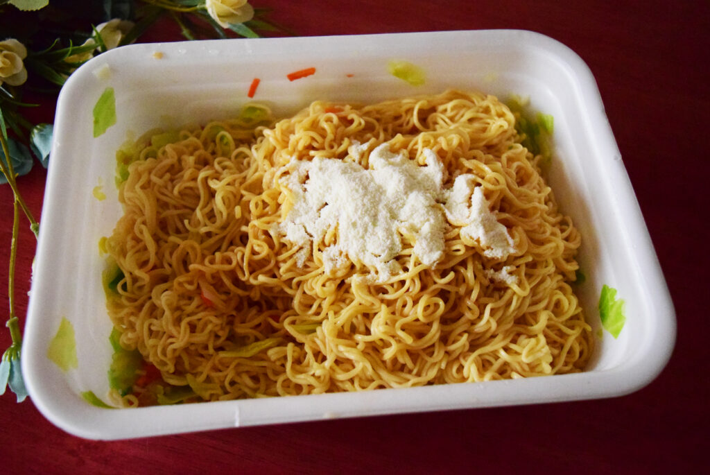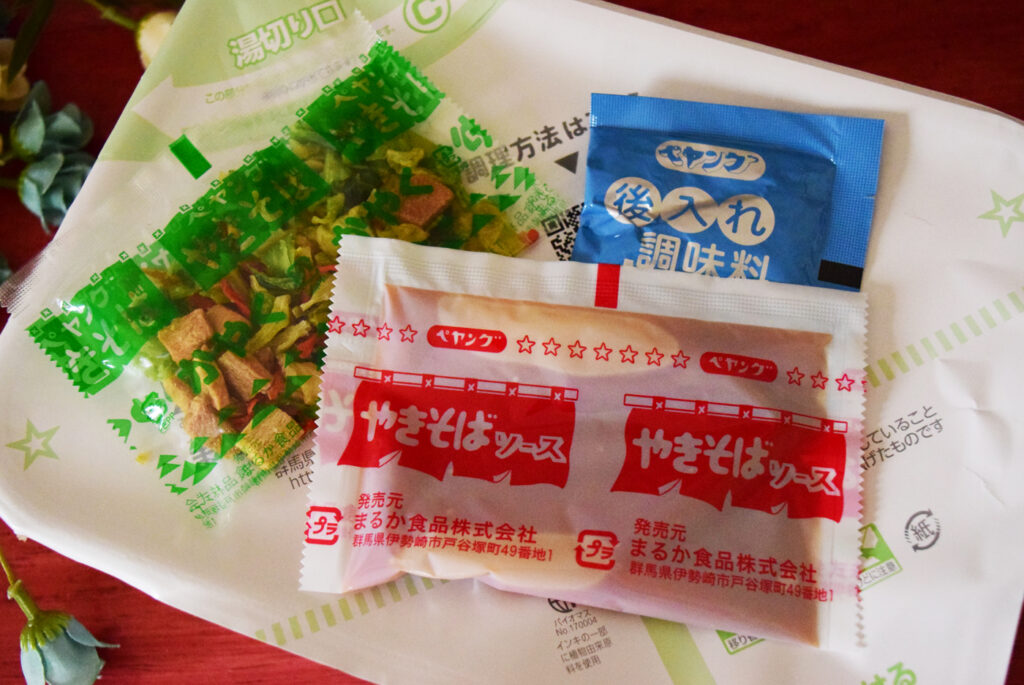 カップに中には後入れの粉チーズと添付ソース、キャベツ・鶏肉・人参がはいったかやくが入っていました。