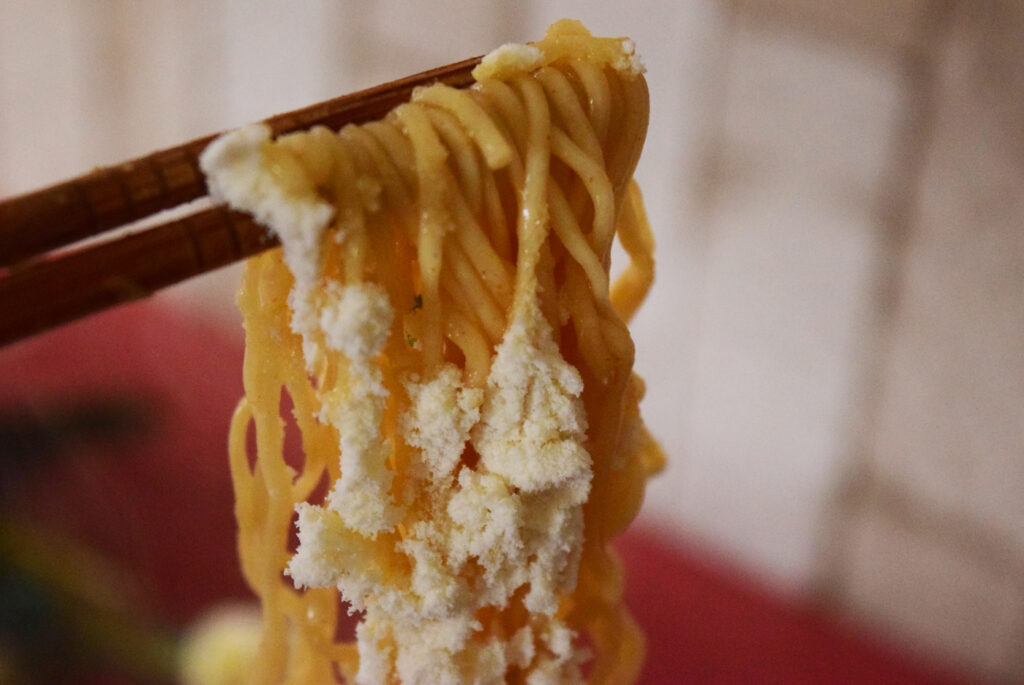 タッカルビのような少し甘い味でありながら、後からくる辛さがクセになりそう。チーズが甘辛のソースと合わさり、コクを増しているのがいいですね。細麺が甘辛ソースと上手く合わさり、なかなか箸が止まらなくなる美味しさです。ただ、辛いだけよりも筆者はこちらのような味付けの方が好きですね。