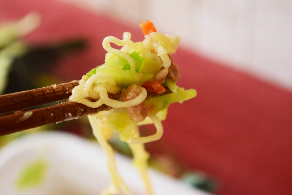 キャベツと鶏肉はカップ麺としては多く、十分満足できる量でした。最近流行りの大豆ミートではないところが筆者としては好感を持てます。