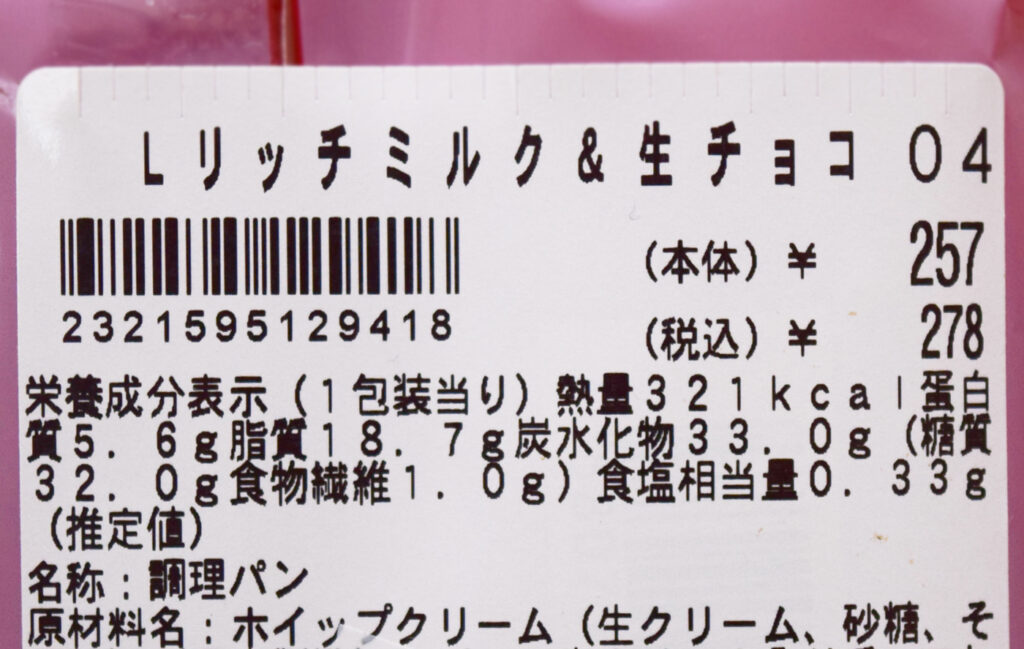 1個あたり321kcal。糖質は32.0gです。普通のおやつコッペが304kcalなのでチョコが入っている分、すこしカロリー高めになってます。