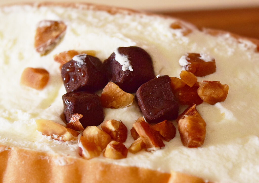 クリームの上にアーモンドと生チョコがのったコッペパン。コッペパンのサイズとしては普通のコッペパンと同じくらいです。