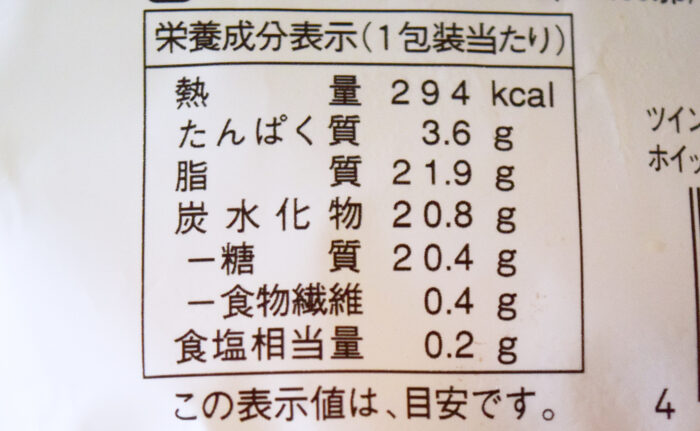 1個当たり294kcal。たんぱく質3.6g・脂質21.9g・糖質は20.4g・食塩相当量0.2gです。