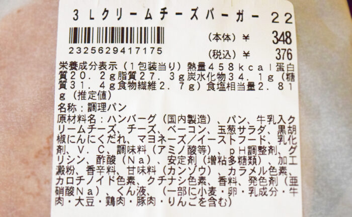 1個当たり458kcal。糖質は31.4gです。原材料を見るとクリームチーズとチーズが書かれていますね。