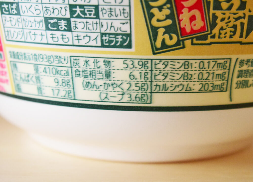1食410kcal。たんぱく質9.8g・脂質17.2g・炭水化物53.9g・食塩相当量6.1g(めん・かやく2.5g・スープ3.6g)です。
