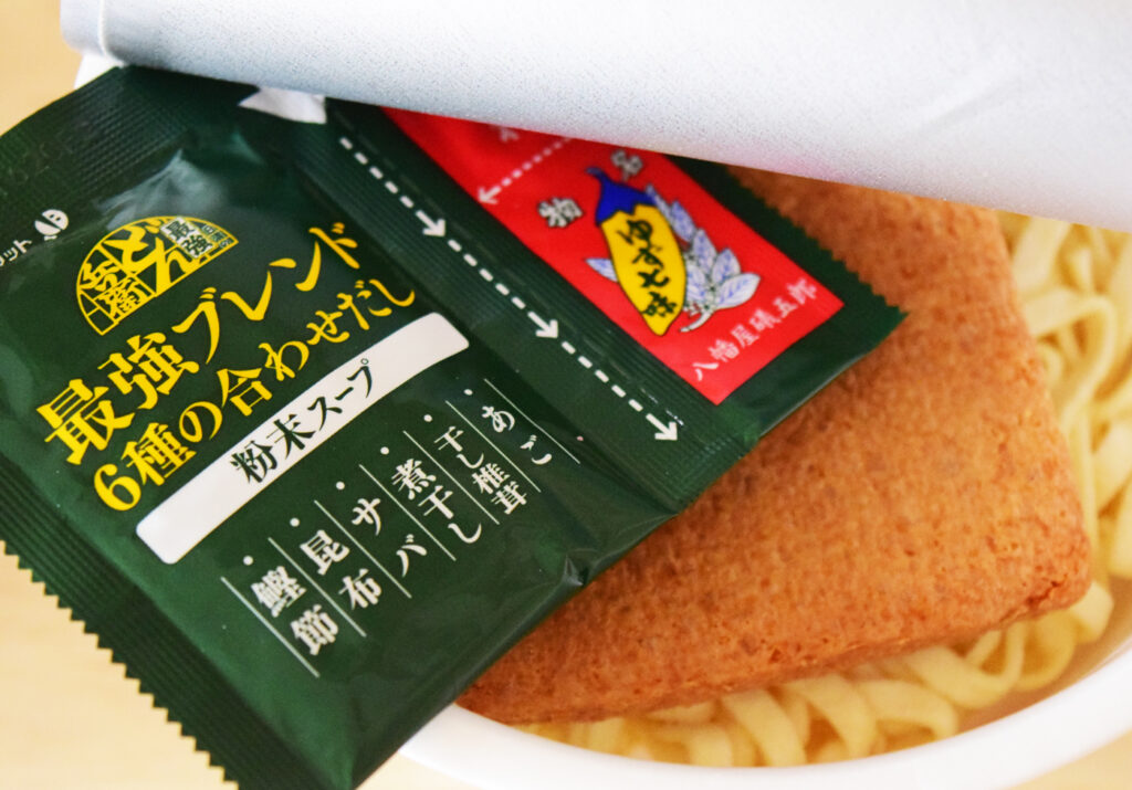 こちらが日清の最強どん兵衛 きつねうどん。パッケージからして豪華で美味しそうですよね。公式HPには「もちもちとした食感の “極太うどん”、昆布の後引く旨みが特長の6種の合わせだしを使用したつゆ、通常よりもぶ厚い “ふっくらおあげ”、長野県の老舗「八幡屋礒五郎」で特別に調合した「特製ゆず七味唐辛子」。こだわり抜いた「最強どん兵衛」です。」と紹介されています。