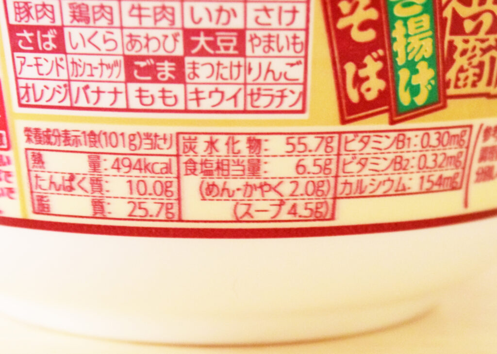 1食494kcal。たんぱく質10g・脂質25.7g・炭水化物55.7g・食塩相当量6.5g(めん・かやく2.0g・スープ4.5g)です。