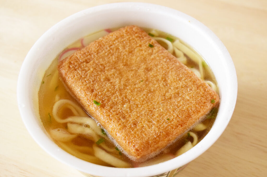 完成品はこちら。見た目からして通常のどん兵衛と異なりますね。麺もそうですが…おあげが厚い!