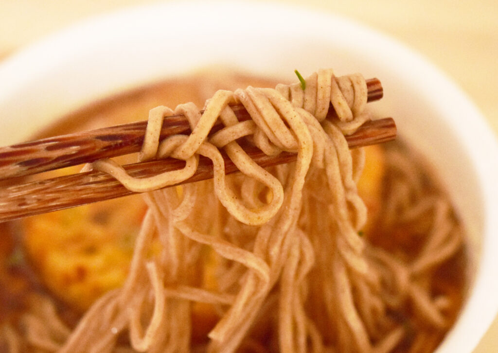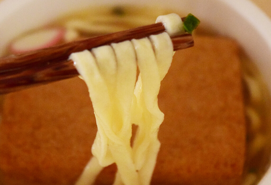 麺は普通のどん兵衛と比較すると、もっちもち。もちもちの麺でありながら、のどごしが抜群で食べやすい!