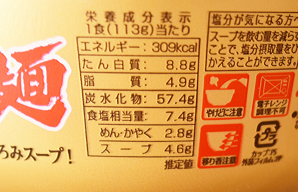 1食(113g)あたり309kcal。食塩相当量は全体で7.4g(めん・かやくは2.8g、スープは4.6g)です。