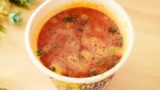 スープに熱湯を入れてみました。白濁スープはお店で食べるスープと見た目はほとんど変わりません。若干豚骨臭もします。このスープの中にゆで上がった麺を入れ、トッピングを載せたら完成です。