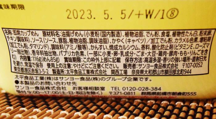 原材料のソースを見てみるとソース・豚脂・植物油脂・調味油脂の4種類とシンプルな内容でした。
