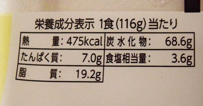 1食(116g)当たり475kcal。炭水化物は68.6gで食塩相当量は3.6g。