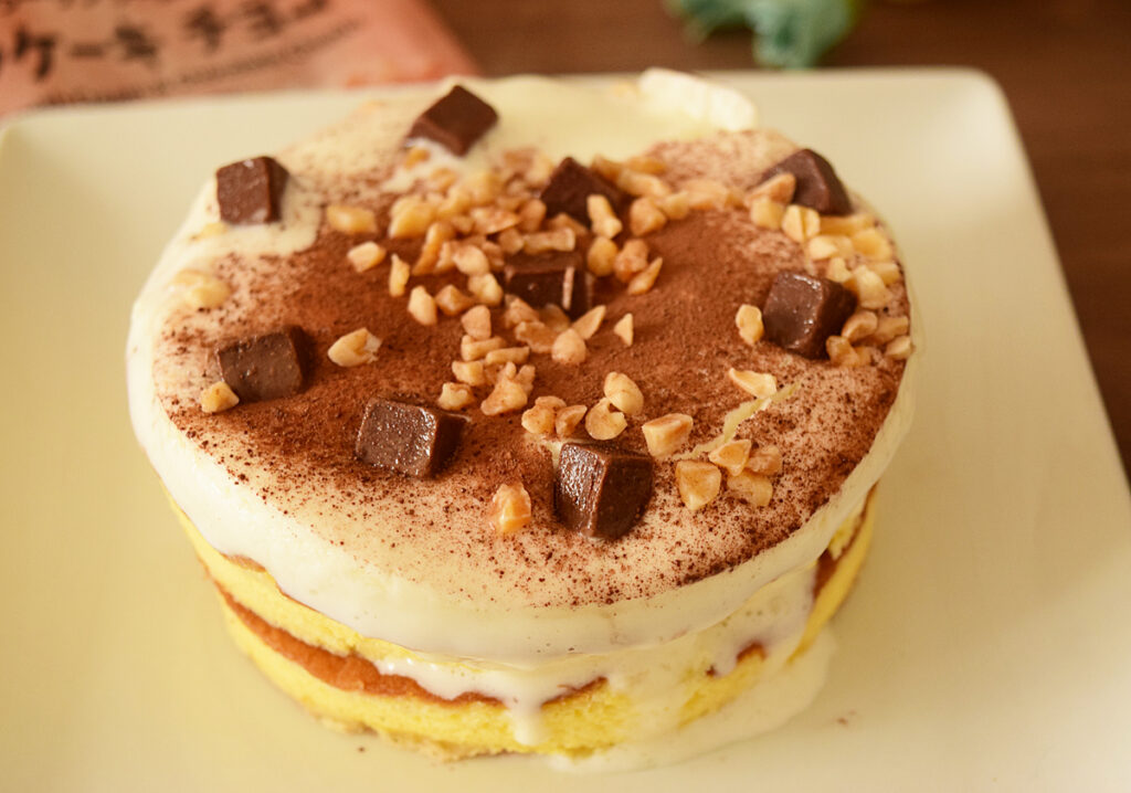 パンケーキは2枚重なっていますね。その上にミルククリームやチョコレートチャンク、アーモンド、ココアパウダーがのっています。