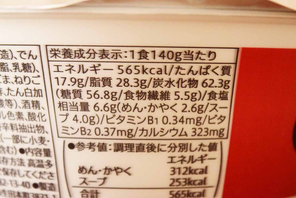 1食(140g)565kcal(めん・かやく312kcal、スープ253kcal)、糖質は56.8gで食塩相当量は6.6g(めん・かやく2.6g、スープ4.0g)。