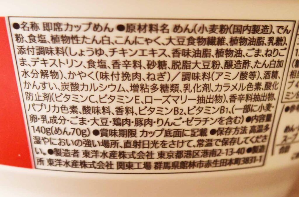原材料のスープには醤油・チキンエキスなどがメイン含まれています。製造元は東洋水産でした。