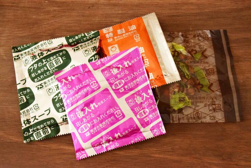 後入れの液体スープと粉末スープ。特製油、かやくの4種類が麺と一緒に入っていました。