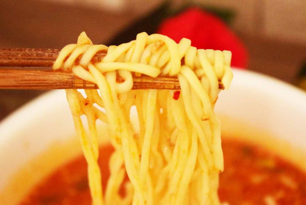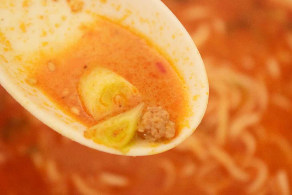 まずはスープを一口。花椒とラー油が効いていて結構辛いです。カップラーメンは辛さを抑えている商品が多い中、こちらのラーメンはかなり攻めています。