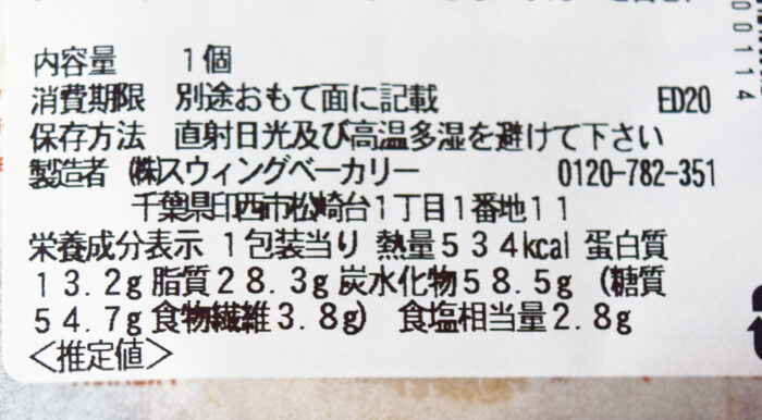 1個当たり534kcal。糖質54.7gで食塩相当量は2.8g。こちらは特に電子レンジ温めについての記載はなし。